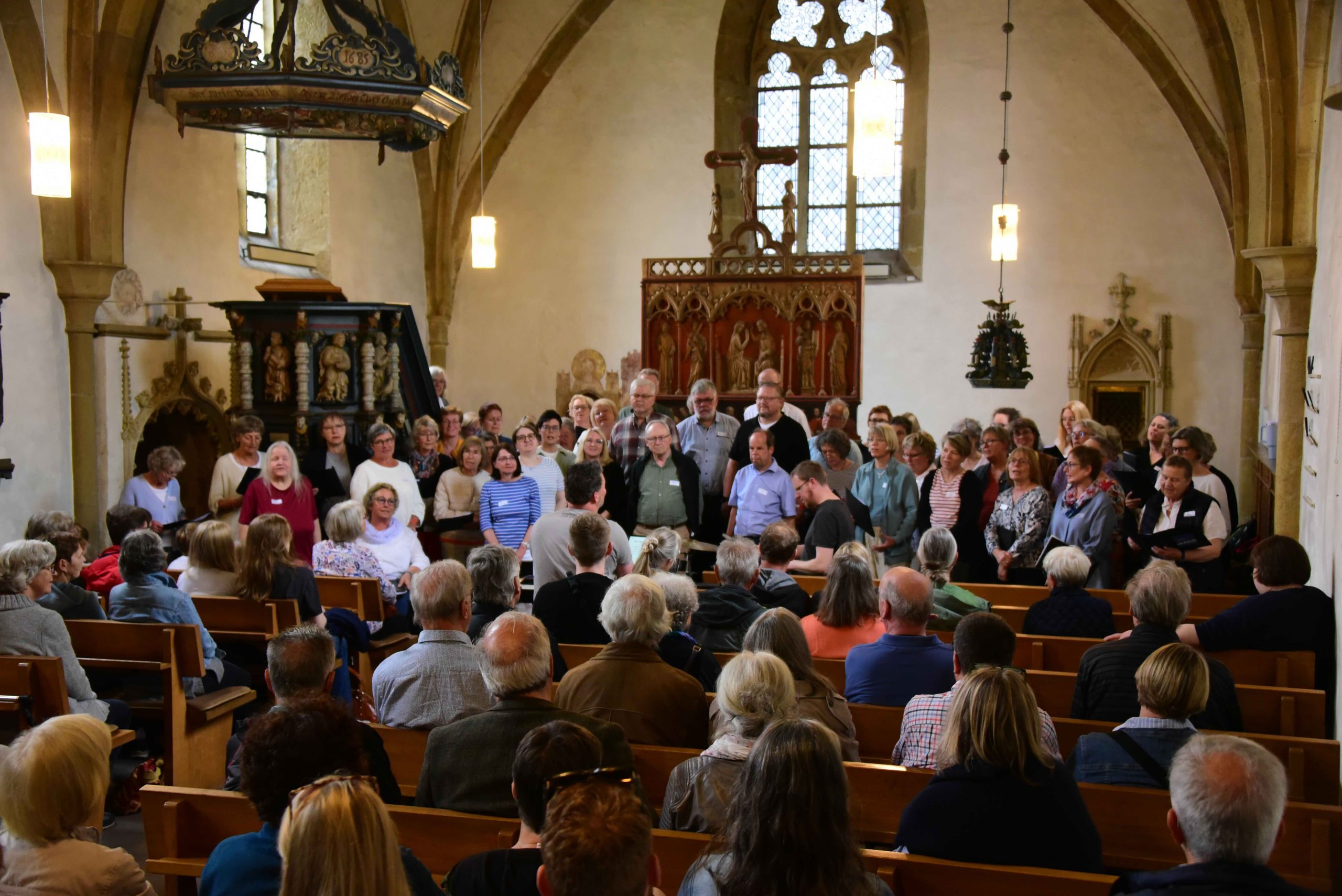 Zum Abschluss nahm der Workshopchor dann vor 18 Uhr Aufstellung in der Peterskirche. Der Altarraum wurde komplett ausgefüllt und wir waren so zeitig fertig, dass Kai die Zeit bis zum Konzertbeginn noch spontan mit mehreren Liedwünschen aus dem Publikum füllte. Dann war auch der letzte Platz im Kirchenschiff besetzt und es konnte losgehen.